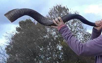 Here’s a photo of me playing our kudu shofar on a camping trip.